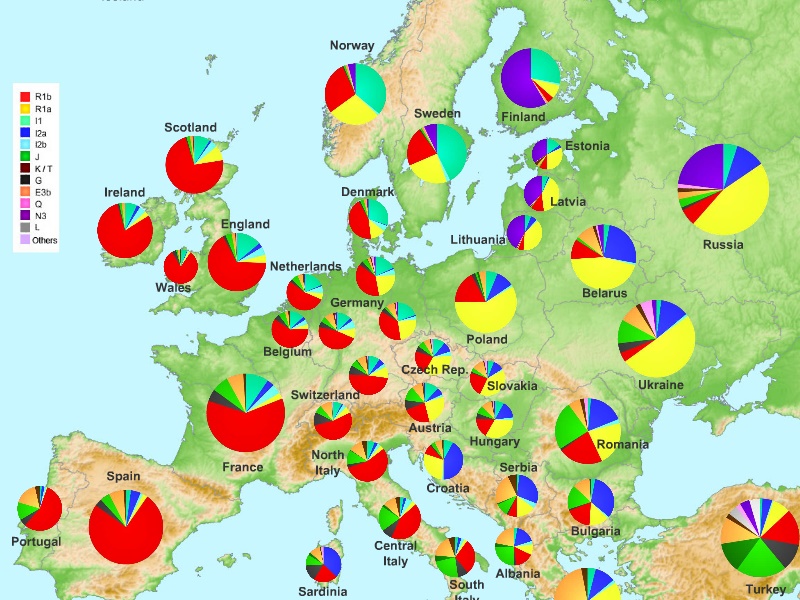 Aşağıda Eupedia.com tarafından haplogruplara göre hazırlanmış olan Avrupa genetik haritasını görmektesiniz. Haplogruplar ortak atadan gelmeyi temsil eder ve popülasyonlardaki genetik yapıyı incelemenin farklı yollarından biridir.