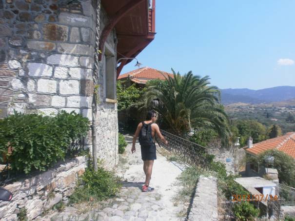 Geldiğimiz yolu dağların arasında dolana dolana geri döndük ve güneye doğru devam ettik. Erasos diye bir yer çıktı karşımıza. Saptık içeri. Arabayı kasabanın girişindeki otoparka bıraktık. Otopark parasız. İçeri girince ufacık ama çok çok güzel bir tatil kasabası olduğunu gördük. Deniz kıyısında yani ilk sırada çoğunlukla restoranlar var. Oteller daha çok arka sırada. Yine de deniz kenarında bir otel bulduk. Balkonu denize doğru uzanan güzel ve temiz bir oda. Kasabaya giren yoldan denize doğru inerken sola dönüp en sona kadar yürüyünce deniz kenarındaki otelde kaldık(Surf Hotel). Oda fiyatı 40 €, fakat kahvaltı yok. Ufak ve mütevazi bir aile işletmesi. Oda gayet temizdi. Banyosu temiz ama oldukça basit. Rüzgar poyraz estiği için bu tarafta deniz çok sakindi. Plaj kumluk. Windsurf için çok uygun bir yer, zaten denizde bir sürü surfçü vardı. Otelin tam karşısında 15 dk lık yüzme mesafesinde ufak bir kayalık ada var. Hem görüntüsü hem yüzmesi güzeldi.