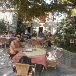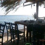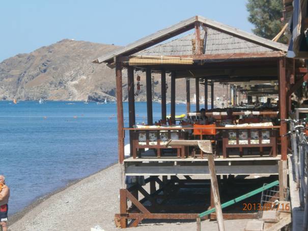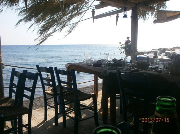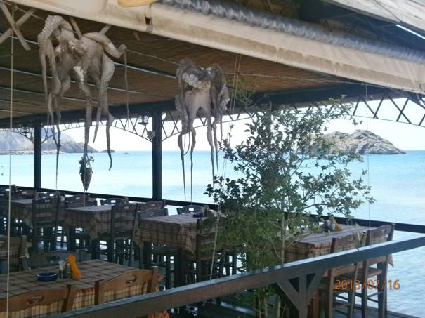 Yemek için, kaldığımız otelin tam zıt tarafına yani denize bakarken sağa doğru yürürken en sondaki yeri beğendik.(blue taverna) Bu sefer farklı olarak sardalya yedik, nefisti. Sahibi tam bir adalı, çıplak gezen, sakallı eğlenceli bir adam. Hemen hemen öncekilerle aynı hesabı ödedik. Gece eğlencesi için de sahilde müzikli içkili hoş yerler var. Erasos’u çok sevdik.