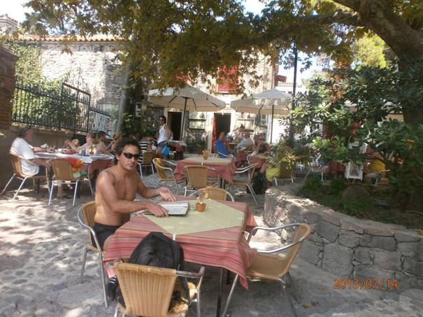 Molivosta Kaleye doğru çıkan dar sokaklarda, birbiri ile içiçe küçük evlerin arasında gezinmek çok zevkli. Buralarda gezinirken harika bir çınaraltı restoranı ile karşılaştık. Karnımızı doyurmak için oturduk ve adada kaldığımız süre boyunca en lezzetli yemeği yedik. Burayı ara sokaklarda dolaşırken tesadüfen bulduğumuz için tarif etmek zor ama çektiğimiz bir fotoğraftan ismini bulmayı başardık. Tropicana Platanos, Facebook sayfaları da var. Çupra,karides,midye,kalamar,yunan salatası, mezeler,ouzo için 35€ verdik.