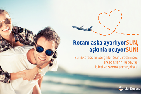 SunExpress 14 şanslı çifte yurt içi gidiş-dönüş uçak bileti hediye ediyor! 14 Şubat Sevgililer Gününde rotanı aşka ayarlıyorSUN ve aşkınla uçuyorSUN! Hemen “Aşka uçuyorSUN” uygulamasına girip rotanızı seçin ve çekilişe…