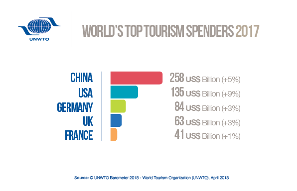 Raporda da vurgulandığı üzere, en büyük 25 kaynak pazarın tamamı 2017 yılında uluslararası turizme yönelik yüksek harcamalar bildirdi. Çin, yurtdışı harcamalardaki liderliğini 258 milyar dolarlık (yerel para biriminde% + 5) harcama ile pekiştirmiş oldu.