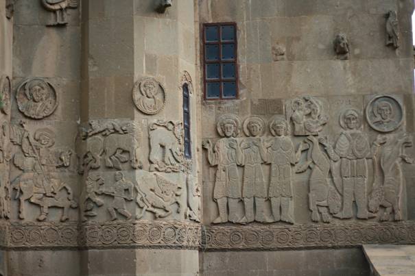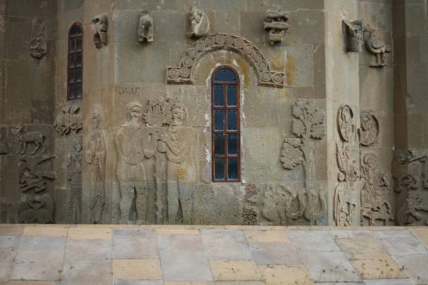 Kilisenin duvarlarında ise daha önce Gürcistan’da gördüğüm bantlar halinde taş kabartmalar ve bunları konu alan İncil ve Tevrat’tan alınan kutsal isimler ve av sahneleri yapılmış.