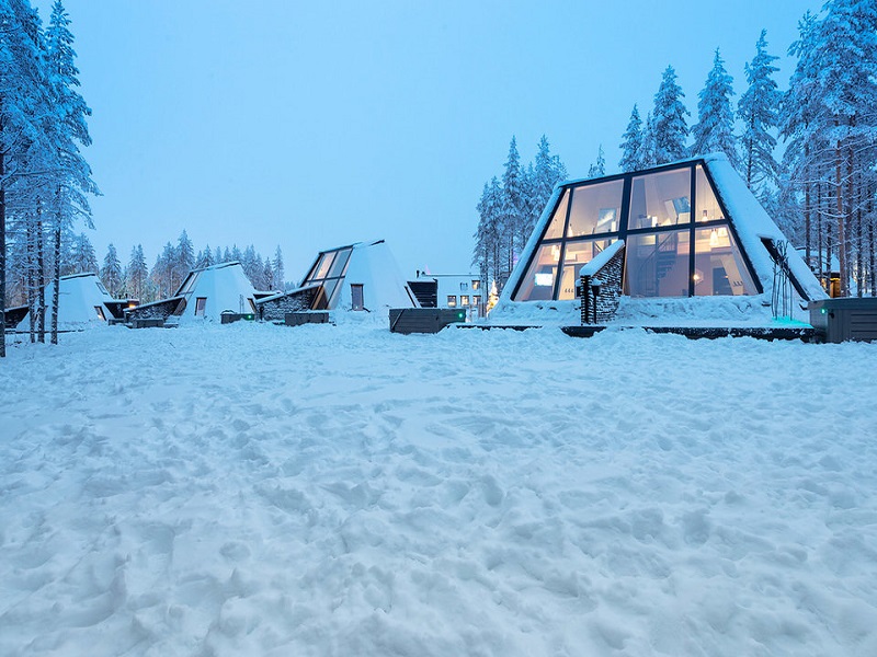 Rovaniemi’deki Santa Claus (Noel Baba) Köyü yakınında yer alan otel, sık bir ormanın içine gizlenmiş bir dizi şeffaf kabinden oluşuyor.