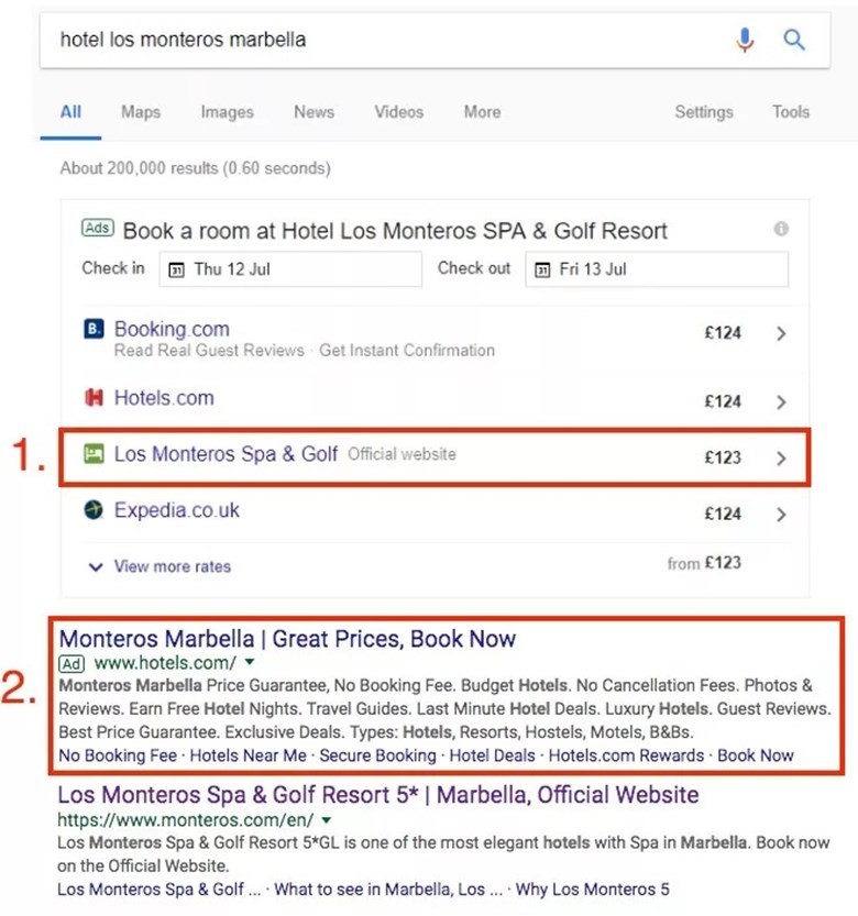Google Otel Reklamları, özellikle de komisyon modu ile normal durum, hiçbir zaman sınırlaması olmaksızın tüm pazarlarda kampanyaların açık olmasını sağlamaktır. Bu durumlarda, OTA AdWords pahasına görünürlük elde edeceğinizden, değişiklik size fayda sağlayacaktır. Bu yatırımlardan OTA’lardan daha düşük bir maliyetle para kazanabiliyorsanız dağıtım maliyetleriniz düşecektir. İşte bir örnek: