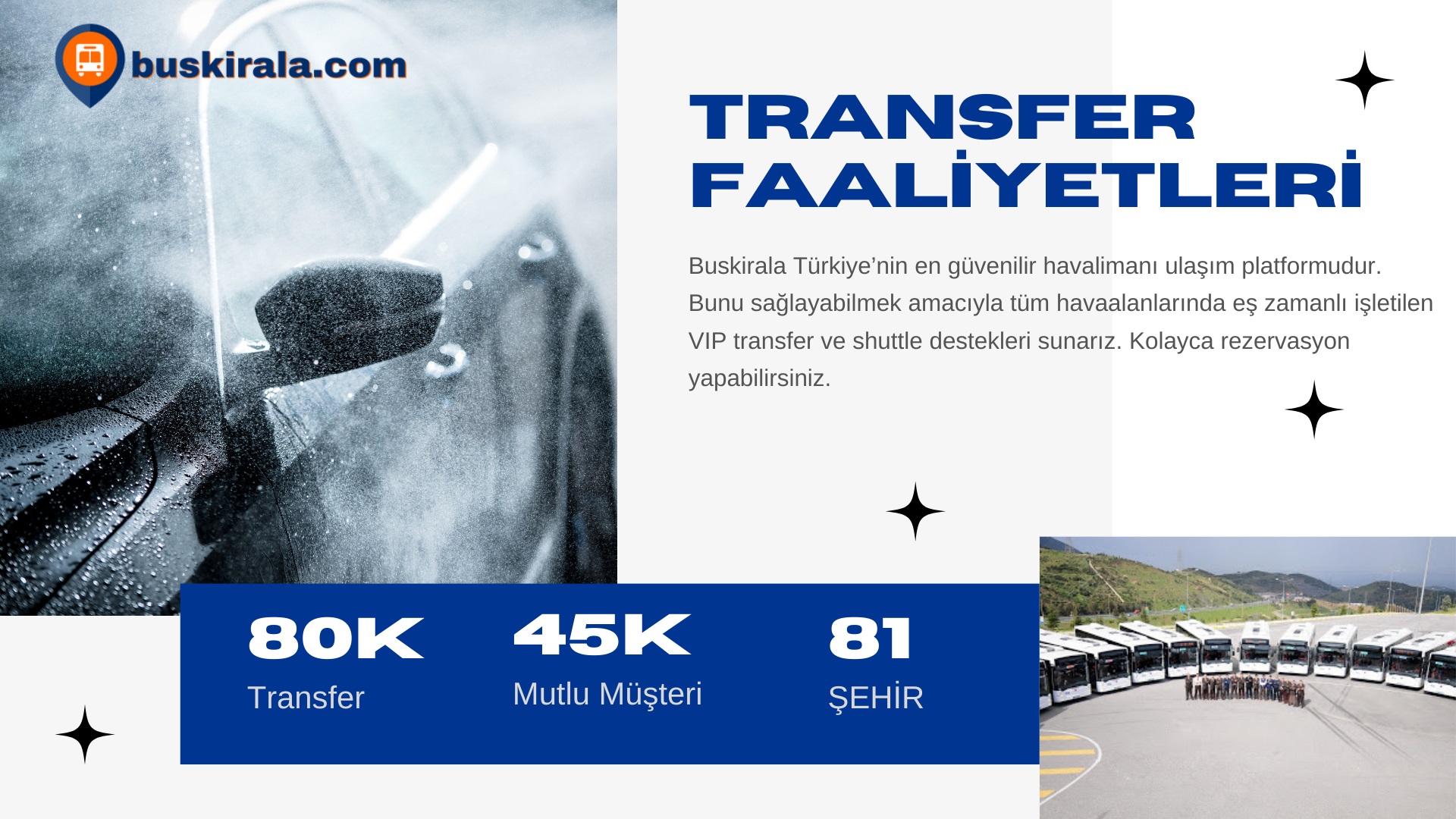 Ülkemizin tüm havalimanlarında havalimanı transfer hizmeti veren Buskirala, otomobil, vip araç, minibüs ve otobüs filosuyla ulaşım desteklerini sürdürmektedir. Deneyimli sürücüler, modern ve bakımlı araçlarla 7/24 transfer faaliyetlerini yürüten ekipler cazip havalimanı transfer fiyatlarıyla fark yaratıyor.