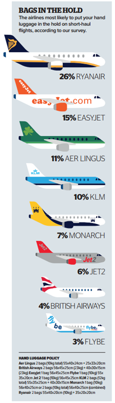 Araştırmanın sonucuna göre, Aer Lingus, KLM, Monarch ve Jet2 gibi diğer taşıyıcılar kısa mesafeli uçuşlarda birçok yolcusunu el bagajından ayrılmak zorunda bırakıyor.