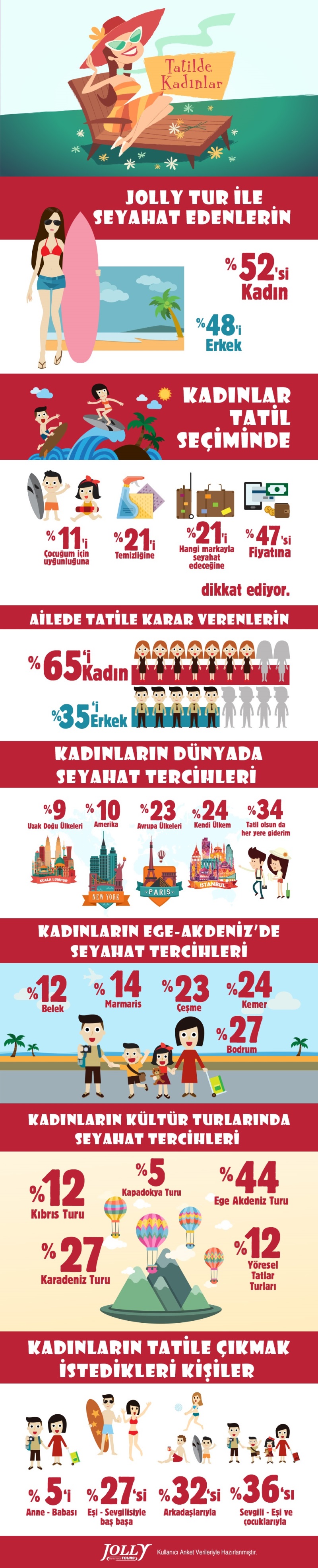 Turizm sektörüne yön veren şirketlerden biri olan Jollytur‘un on binlerce kadın müşterisiyle gerçekleştirdiği online anket sonuçlarına, kadınların sadece tatil alışkanlıklarına ışık tutmakla kalmıyor, ayrıca erkeklerin tatil seçimlerinde de pek çok noktada karar verici olduklarını da gösteriyor…