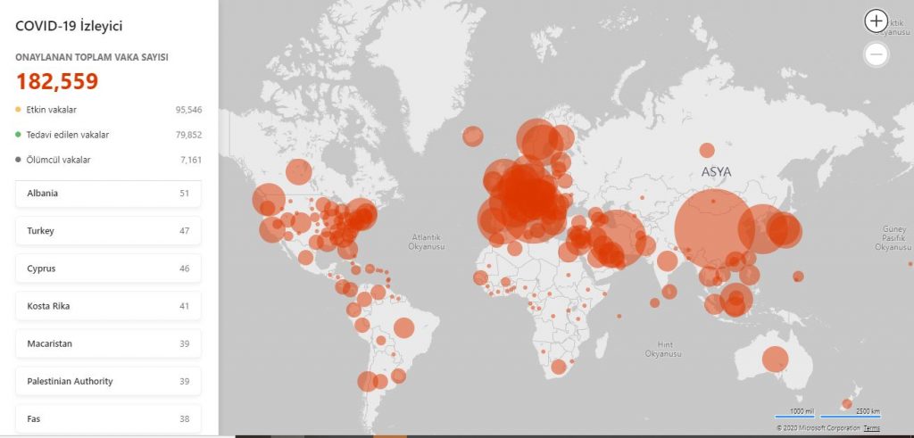 Microsoft Bing arama motoru üzerinden kolayca ulaşılabilen harita sürekli güncelleniyor ve dünyadaki her ülke için güncel enfeksiyon istatistiklerini gösteriyor. Paylaşılan haritaya buradan ulaşabilirsiniz.