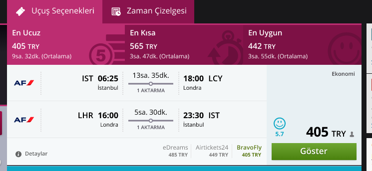 En uygun: En iyi fiyat / uçuş süresi dengesi