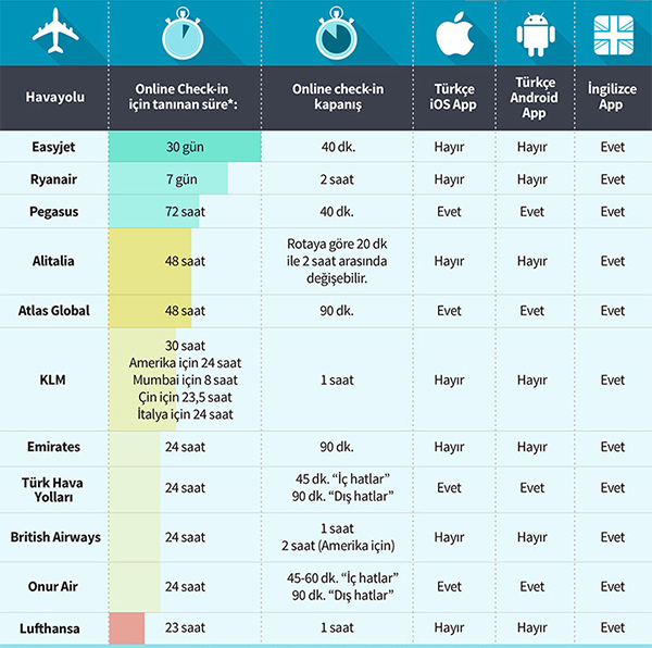Türk Hava Yolları, Lufthansa, British Ariways gibi daha köklü havayolları online check-in işlemini uçuşa yaklaşık 24 saat kala açarken, Pegasus 72 saat önceden açıyor. Ryanair için bu süre 7 güne çıkıyor ve Easyjet için ise 30 günü buluyor. Bu sayede yolcular biniş kartlarını önceden basarak yanlarına alabiliyor ve internet erişiminin sınırlı olduğu durumlarda da rahat edebiliyor.