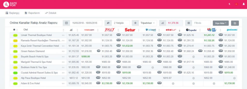 Türkiye’de hizmet veren konaklama tesislerinin online afişe satış fiyatları, RateFor ile yerli ve yabancı 16 online kanal özelinde istenilen kişi sayısı ve tarih aralığına göre çoklu bir şekilde ve tek ekranda raporlanabilecek.