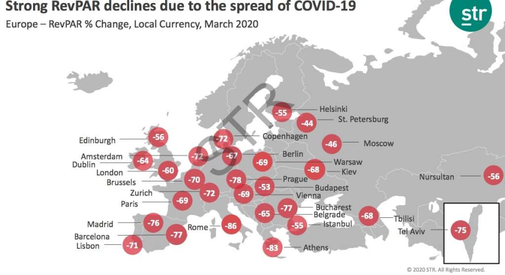 Avrupa ülkeleri arasında mart ayı içerisinde, doluluk oranlarında, en büyük düşüş oranını yüzde 90.8 ile dünyanın en iddialı turizm ülkelerinden İtalya yaşadı. İtalya’nın Mart 2020 doluluk oranı yüzde 6.2 oldu. İtalya’nın Milano kenti de Mart 2020’de doluluk oranlarında yüzde 94.5 ile en büyük düşüşü yaşayan destinasyon oldu. Milano’da doluluk oranı yüzde 4 olarak gerçekleşti. Araştırmada yer alan şehirler arasında dünya genelinde en fazla doluluk oranı yüzde 48.5 ile Sydney’de görülürken, sosyal izolasyon konusunda nispeten daha az tedbir aldığı gözlenen ABD’nin Los Angeles kentinde bu oran yüzde 42.5 oldu. Koronavirüs salgının en ağır etkilerinin yaşandığı New York’ta ise bu oran yüzde 34.5 olarak gerçekleşti. Çin’in başkenti Beijing’de ise yüzde 16.4 oldu. Ülke bazında Avrupa’da Mart 2020’nin en yüksek doluluk oranı ise yüzde 36.5 ile İngiltere’ye ait.