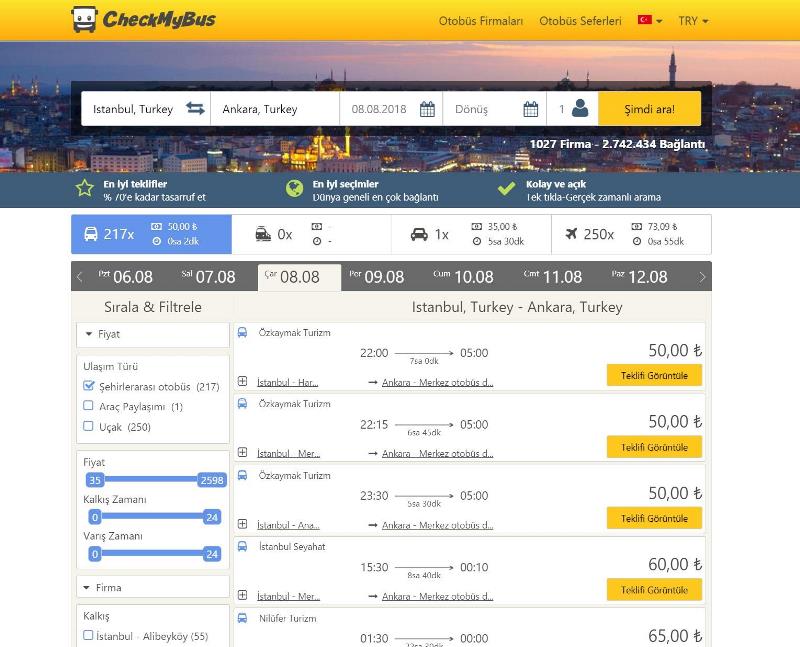 Nürnberg merkezli CheckMyBus, 2013 yılında kuruluşundan bu yana, dünyanın her yerinden kullanıcıların küresel otobüs seyahat seçeneklerini karşılaştırmasını sağlayan eşsiz bir platform haline geldi. Diğer benzer web sitelerine göre daha fazla otobüs firması ve havaalanı servisi ile internet kullanıcılarına günde milyonlarca otobüs seferi sunan CheckMyBus, sadece birkaç yıl içinde dünyanın önde gelen meta-arama motoru olmayı başardı.