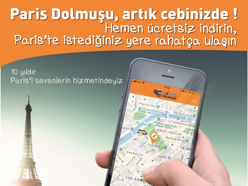 10 yıl içinde Paris’e Türkiye’den gelen misafirlerine farklı bir hizmet sunmak ve hayatlarını kolaylaştırmayı amaç edinen Paris Dolmuşu’nun uygulamasını Google Play, Apple App Store ya da Paris Dolmuşu web sitesindeki barkodu okutarak ücretsiz olarak cep telefonlarınıza ve tabletlerinize indirebilirsiniz.
