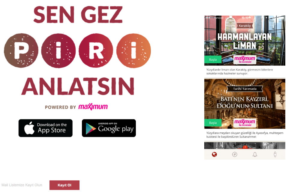 Uygulama içerisinden keşfetmek istediğiniz turu satın alarak mobil veri ya da kablosuz ağ bağlantısı üzerinden yükleyebilir ve sonrasında çevrimdışı olarak kullanabilirsiniz. Tura başlamak için yapmanız gereken, uygulama içerisindeki harita üzerinden görebileceğiniz başlangıç noktasına gitmek. Piri konumunuzu GPS üzerinden algılayarak otomatik olarak bulunduğunuz noktanın hikayesini başlatacak. Tur boyunca uygulama ekranındaki pusula aracılığıyla yönünüzü bulabilir; harita ekranından rotanızı takip edebilir ve mola vermek ya da alışveriş için size özel mekan önerilerini görebilirsiniz.