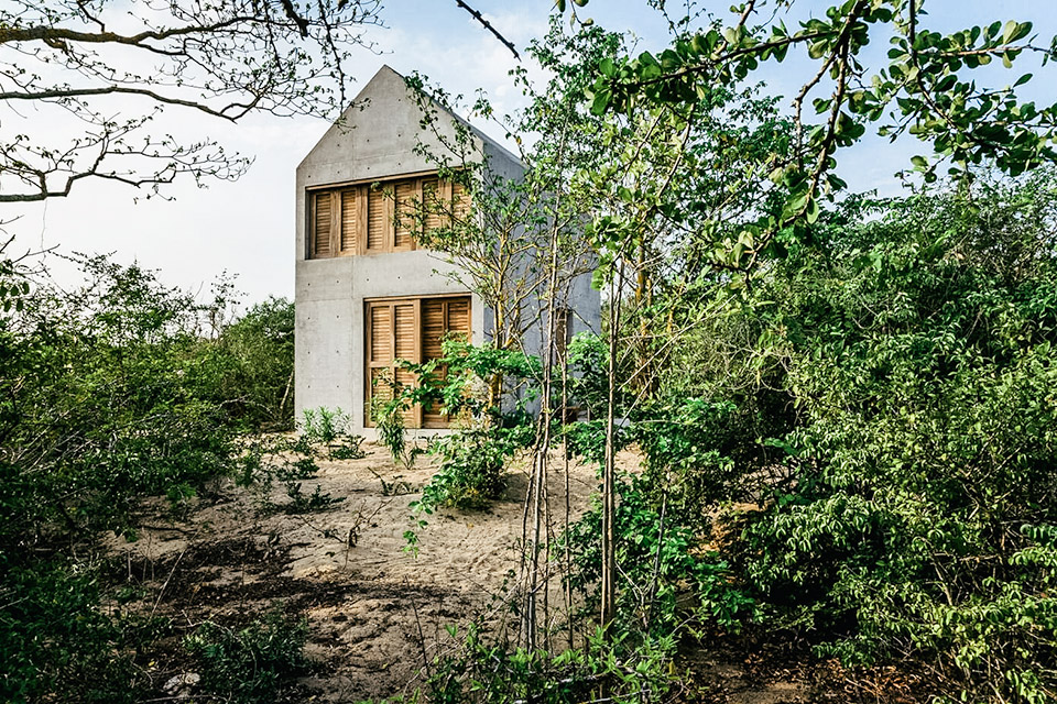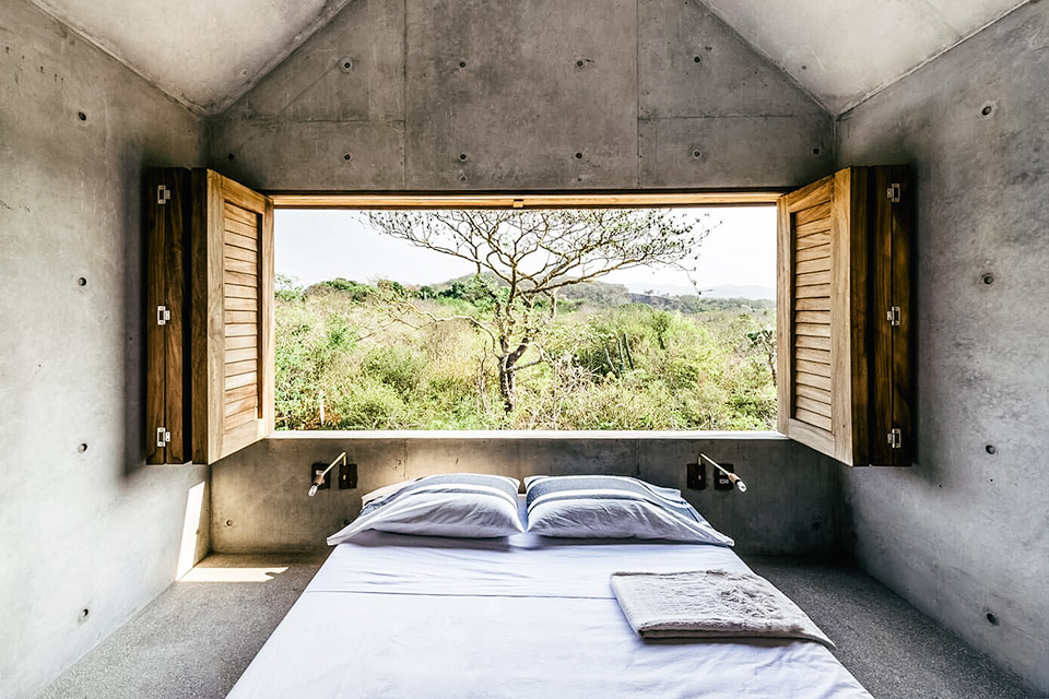 Oaxacan sahil şehrinin bitki örtüsü içine sokulmuş Puerto Escondido beton evi mütevazılığın keyfini çıkarıyor. Duvarlar, üçgen çatı, zemin, yüksek uyku alanları, merdivenler, evye ve verandaya uzanan ve ana yemek alanını oluşturan mutfak tezgâhı dâhil olmak üzere yapının tamamı betondan meydana gelmektedir.