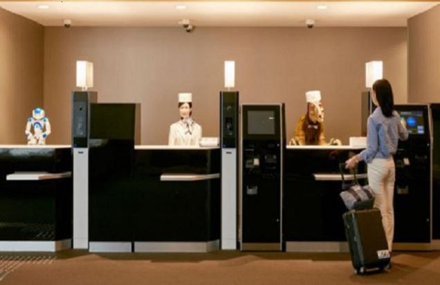 Otel resepsiyonunda robotlar misafirleri karşılayıp otele girişleri için yardımcı oluyorlar.