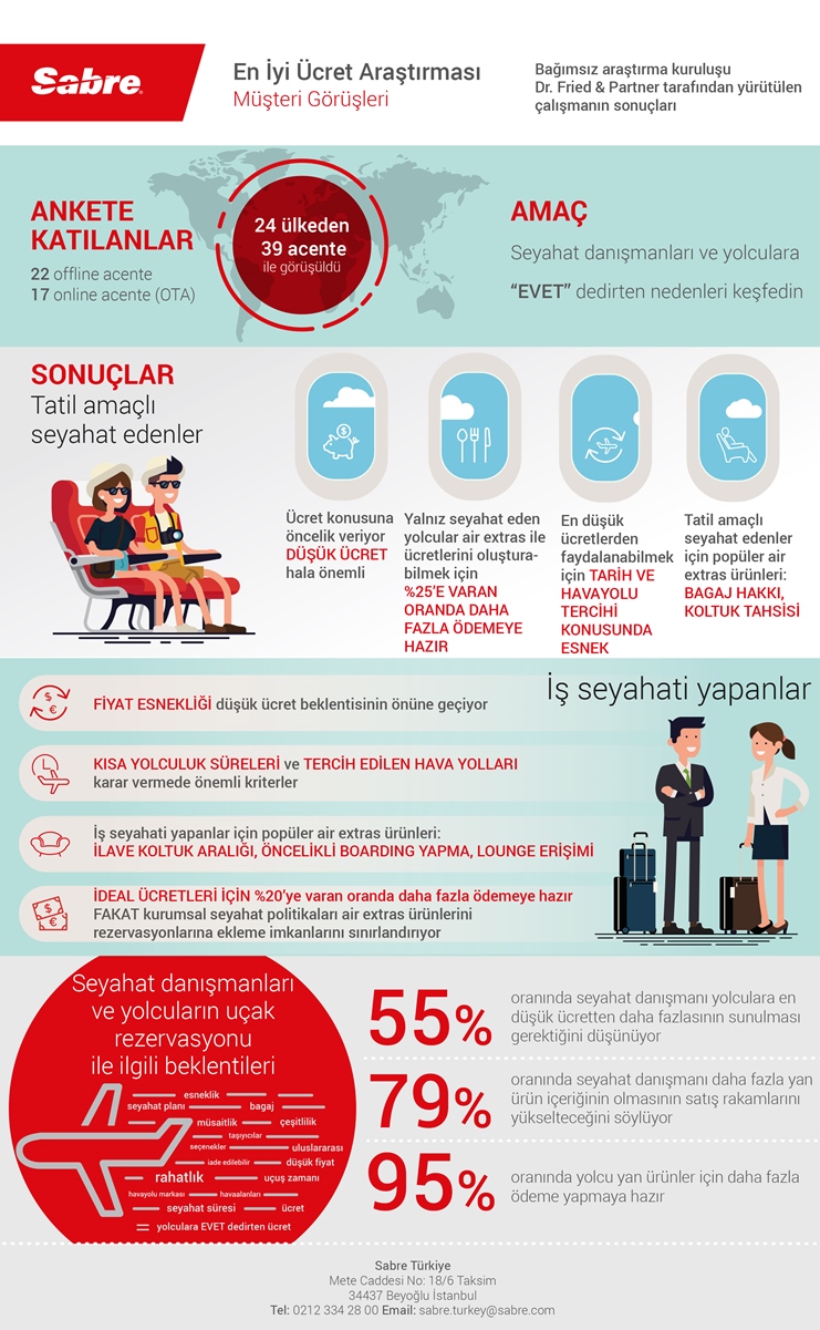 Seyahat ve turizm sektörünün küresel teknoloji sağlayıcısı Sabre Corporation’ın bağımsız araştırma kuruluşu Dr. Fried ve Partner ile gerçekleştirmiş olduğu, Sabre müşterisi olan 24 ülkedeki 39 seyahat acentesinin (offline ve online/OTA) ve seyahat uzmanlarının görüşlerini içeren araştırma raporunun sonuçları açıklandı.
