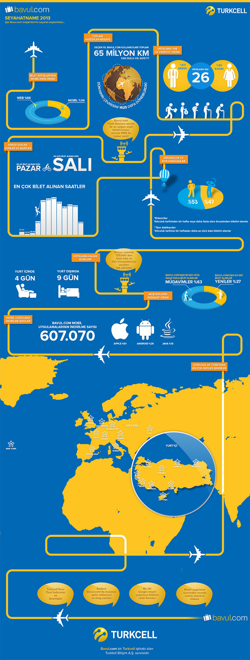 Turkcell iştiraki Türktell’in bir servisi olan bavul.com 2013 verilerini Seyahatname 2013 adıyla hazırladığı bir infografik ile yayınladı. Verileri okumakta zorlandığımız bu çalışmaya göre, 2013 yılında toplam 65 milyon km yol kateden bavul.com yolcularının %34′ü biletlerini mobil telefonları ile satın almış. Yaş ortalaması 26 olan bu yolcuların %40′ı kadınlardan oluşuyor. En çok biletin salı günü satıldığı serviste, yolcuların %47′si biletlerini yolculuk tarihine bir haftadan az süre satın almışlar. %61 IOS, % 26 Android ve %13 Java platformlarında olmak üzere bavul.com mobil uygulamaları 607.070 kişi tarafından indirilmiş. Yurtiçi yolculuklarda İstanbul, Ankara, İzmir, Antalya ve Muğla ilk 5′i oluştururken, yurtdışı yolculukların sıralamasında Amsterdam, Londra, Paris, Viyana ve Dusseldorf şehirlerinde oluşmuş.