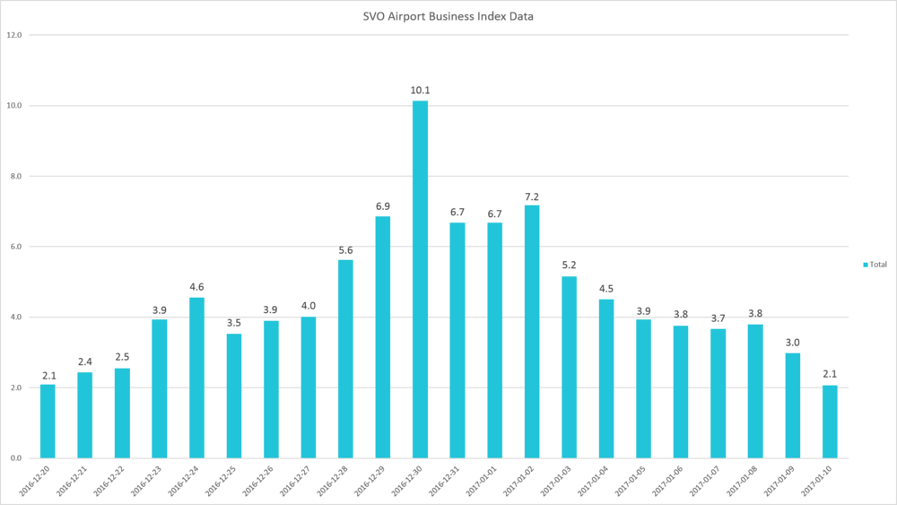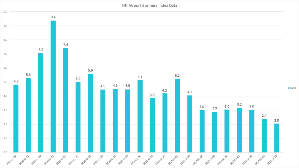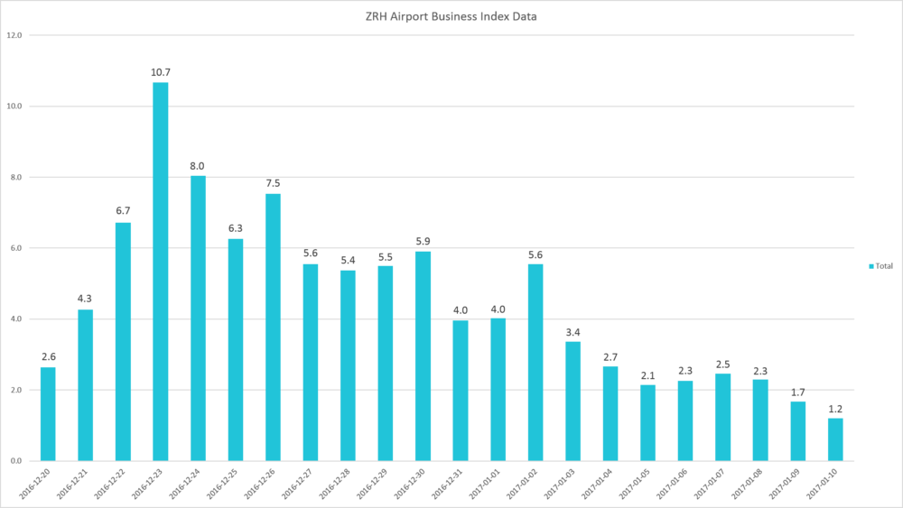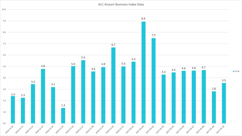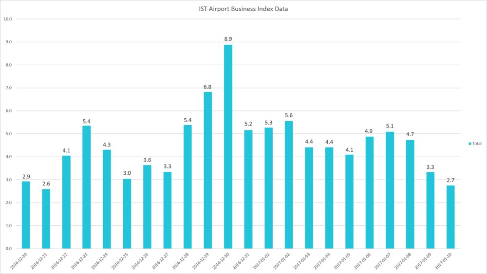 Bu havaalanlarının her birinde yaşanan artışı göstermek için tatil süresindeki her günün endeksini yoğun günün endeksini gösteren (aşağıda bulunan) bir dizi çizelge de yayınladı
