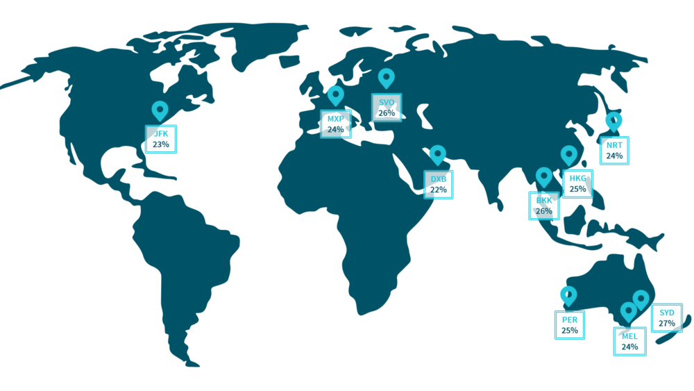 Skyscanner “Travel Insight” verilerine göre en büyük havaalanlarından hangilerinde tatil döneminde sayıların artış göstereceğini haritalandırarak belirlerdik. Haritada yer alan rakamlar, dördüncü çeyrekteki tatil döneminde seyahat edenlerin yüzdelerini gösteriyor.