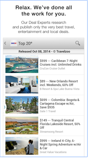 Travelzoo son dakika seyahatleri, aktiviteleri ve eğlence etkinliklerini ayağınıza getiriyor! Yerel kişiler gibi şehri yaşamak isteyen turistler ise uygulamanın harita özelliği ile birlikte kendilerine yakın olan aktiviteleri listeleyebilirler. Beyzboldan baleye kadar binbir çeşit aktiviteye bu uygulama sayesinde erişmeniz mümkün. Ayrıca, uygulama yerel kampanya kuponlarını vb. kullanıcılarının telefonlarına gönderiyor ve bu kuponları telefonunuzdan yetkililere göstererek kullanabilmenize imkan sağlıyor.