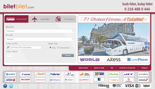 BiletBilet.com otobüs ve uçak biletlerinin online satışını yapan bir sitedir. Sitemiz anlaşma yaptığı firmaların tüm seferlerini, firma adı, saat, fiyat gibi opsiyonlarla karşınıza getirerek, en uygun seyahati, en hızlı ve…