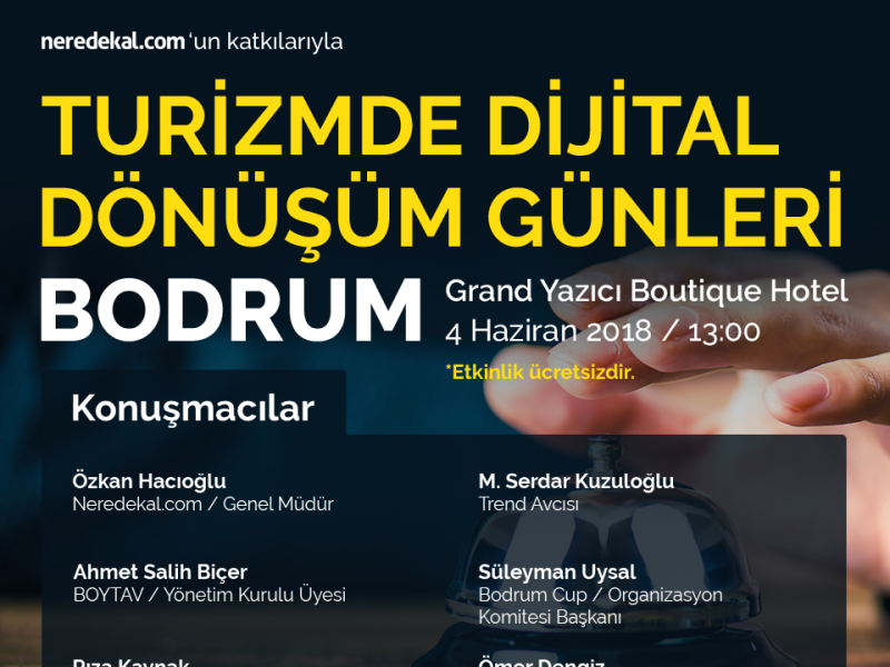Türkiye’nin otel arama motoru Neredekal.com önderliğinde, BOYTAV’ın desteği ile 04 Haziran Pazartesi günü, Bodrum Grand Yazıcı Boutique Hotel’de saat 13:00-17:00 arasında, “Turizmde Dijital Dönüşüm” konulu ve Bodrum’daki küçük-butik ve büyük otellerin katılacağı,…