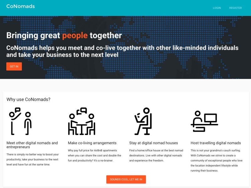 CoNomads, modern zamanın seyyahlarını buluşturuyor. Sistem üzerinde aynı seyahat planı yapan kişileri eşleştirerek birlikte seyahat etmeye teşvik ediyor. CoNomads üzerinden profil açan kişiler gece kuşu, suçu var mı?, parti sever…
