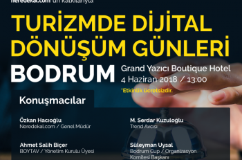 Türkiye’nin otel arama motoru Neredekal.com önderliğinde, BOYTAV’ın desteği ile 04 Haziran Pazartesi günü, Bodrum Grand Yazıcı Boutique Hotel’de saat 13:00-17:00 arasında, “Turizmde Dijital Dönüşüm” konulu ve Bodrum’daki küçük-butik ve büyük otellerin katılacağı,…