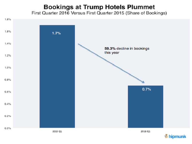 Sonuçlar mı? Hipmunk üzerinde paylaşılan Trump otelleri rezervasyonları karşılaştırıldığında toplam otel rezervasyonlarında yüzde olarak düşüş mevcut, bu düşüş ise geçen yılın aynı dönemiyle karşılaştırıldığında %59’a tekabül ediyor.