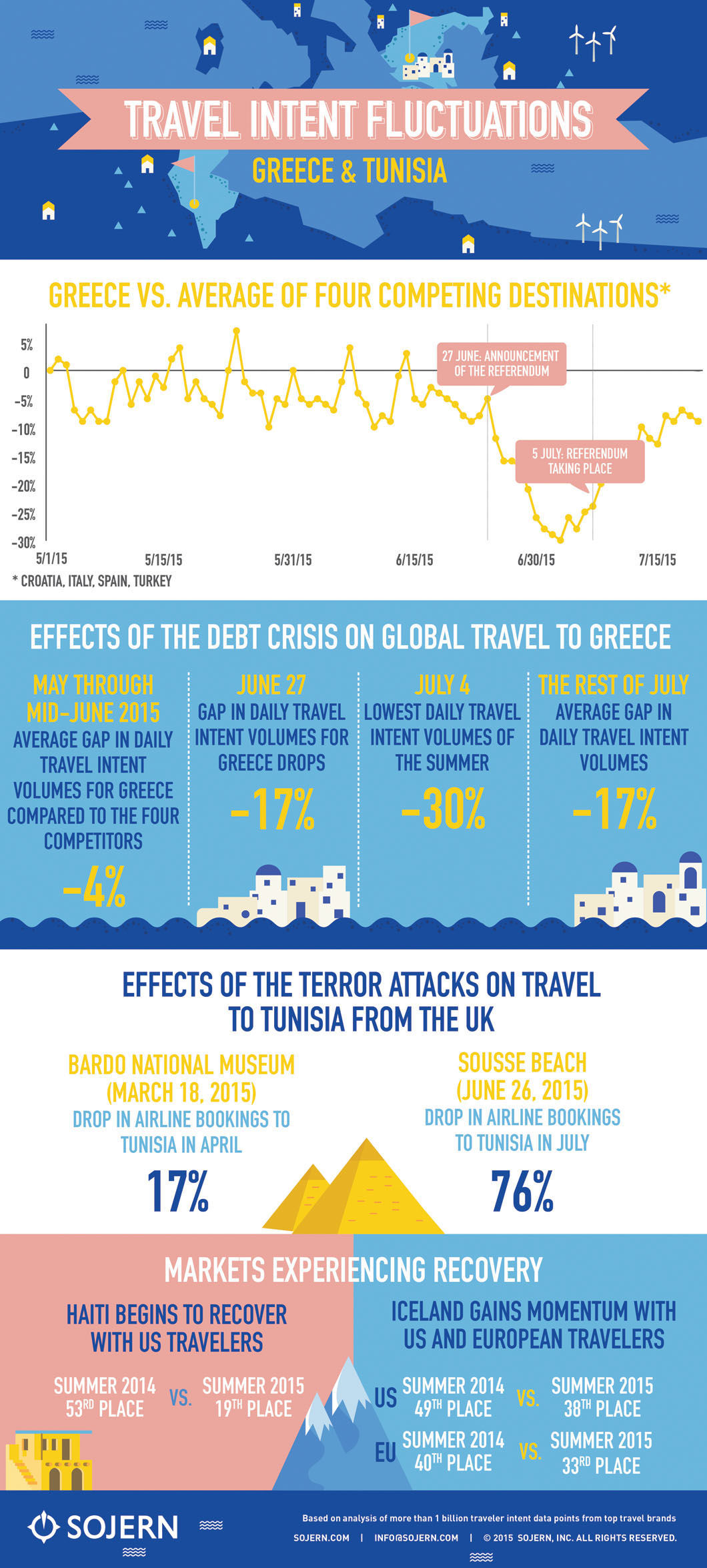 Seyahat isteği, Yunanistan’daki ekonomik bunalımın haziran ayı başlarında tekrar artmasıyla 510 düşüş yaşadı. Avrupa Birliği, IMF ve Yunanistan arasındaki toplantılarda tansiyon arttıkça, turizmdeki düşüş daha da arttı.
