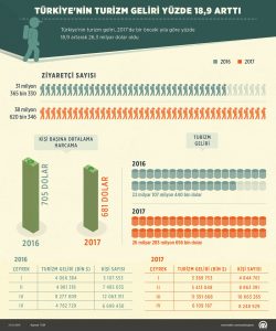 Turizm geliri 2017 yılında bir önceki yıla göre %18,9 artarak 26 milyar 283 milyon 656 bin $ oldu. Turizm gelirinin (cep telefonu dolaşım ve marina hizmet harcamaları hariç) %77,4’ü yabancı ziyaretçilerden, %22,6’sı ise yurt dışında ikamet eden vatandaş ziyaretçilerden elde edildi.