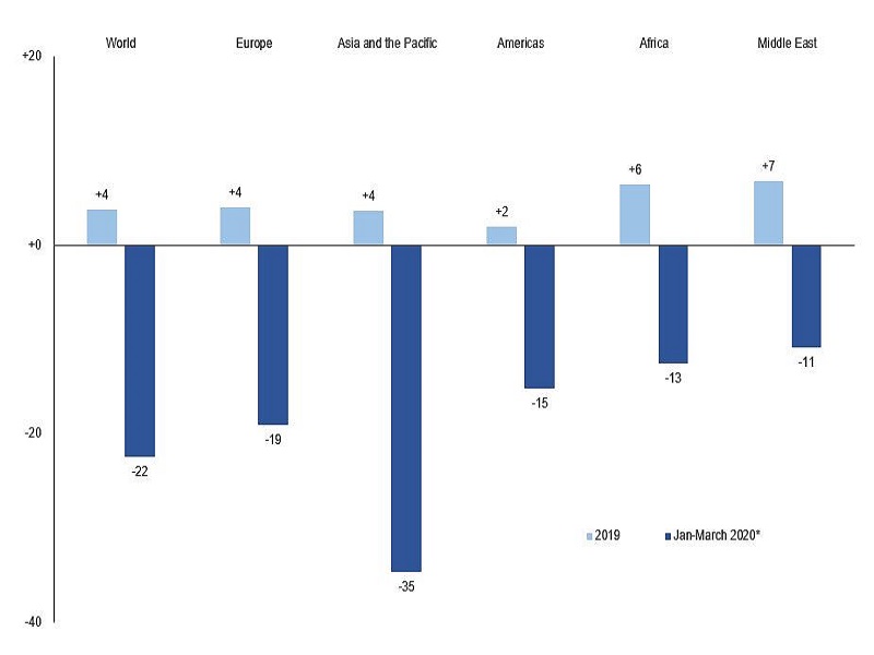 En son UNWTO Dünya Turizm Barometresi’ne göre, varış noktalarına göre raporlanan mevcut veriler yılın ilk üç ayında gelen varışlarda % 22 düşüşe işaret ediyor. Mart ayında varışlar, birçok ülkede bir karantinanın başlamasının yanı sıra, seyahat kısıtlamalarının yaygın olarak başlatılması ve havaalanlarının ve ulusal sınırların kapatılmasının ardından % 57 oranında keskin bir düşüş gösterdi. Bu 67 milyon uluslararası varış ve yaklaşık 80 milyar ABD doları gelir kaybı (turizm ihracatı) anlamına geliyor.