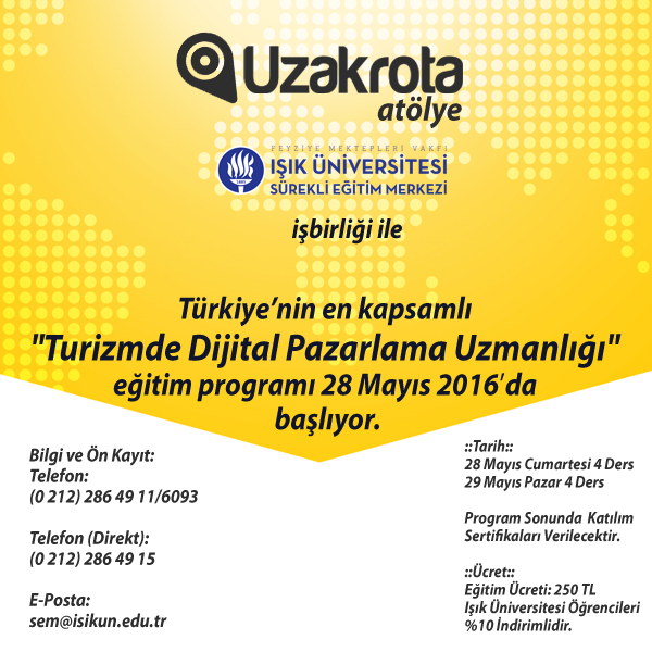 Uzakrota tarafından düzenlenen Uzakrota Atölye kapsamındaki ilk eğitim olan “Turizmde Dijital Pazarlama” eğitimi FMV Işık Üniversitesi Sürekli Eğitim Merkezi (IŞIKSEM) işbirliği ile 28 ve 29 Mayıs tarihlerinde toplamda 8 saatlik eğitim ile karşınızda olacak. Turizm şirketleri, bloglar ve kendini dijital pazarlama konusunda geliştirmek isteyen herkese hitap eden programda dijital iletişim sürecinde stratejilerden günümüzün dijital pazarlama ekosistemine, turizmde arama motoru optimizasyonundan içerik pazarlamasına kadar birçok konu yer alacak.