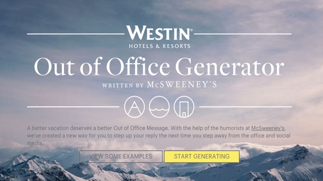 Starwood Hotels grubuna bağlı Westin Otelleri; Amerikalıları tatile çıkmaya ve Westin Otelleri’nde konaklamaya teşvik etmek için, Birleşik Devletlerin New York eyaletindeki BBH New York ve McSweeney’s yayınevleri ile birlikte bir kampanyaya imza atmış: “Out of Office Generator”